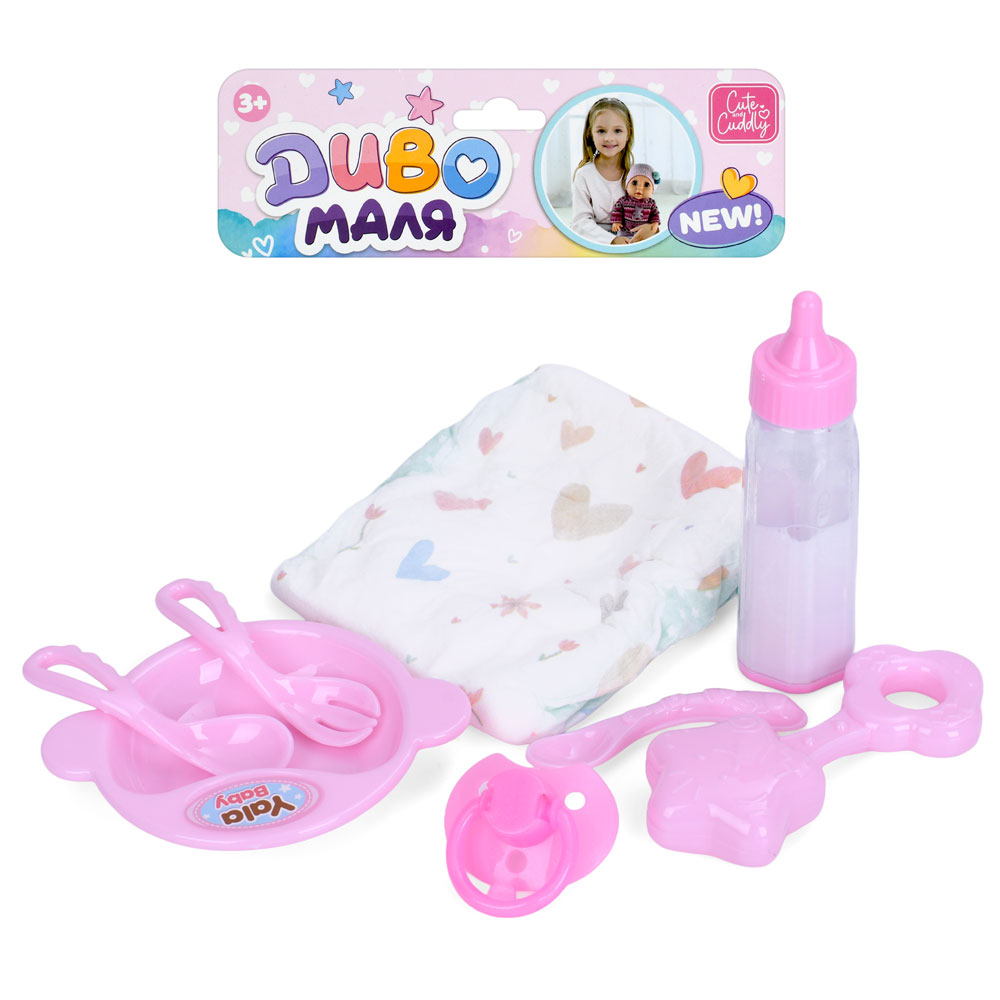 Аксесуари для ляльки YL205H-DM-UA (60шт) тарілка ложки, вилка, пляшка, брязкальце, соска, підгузник,