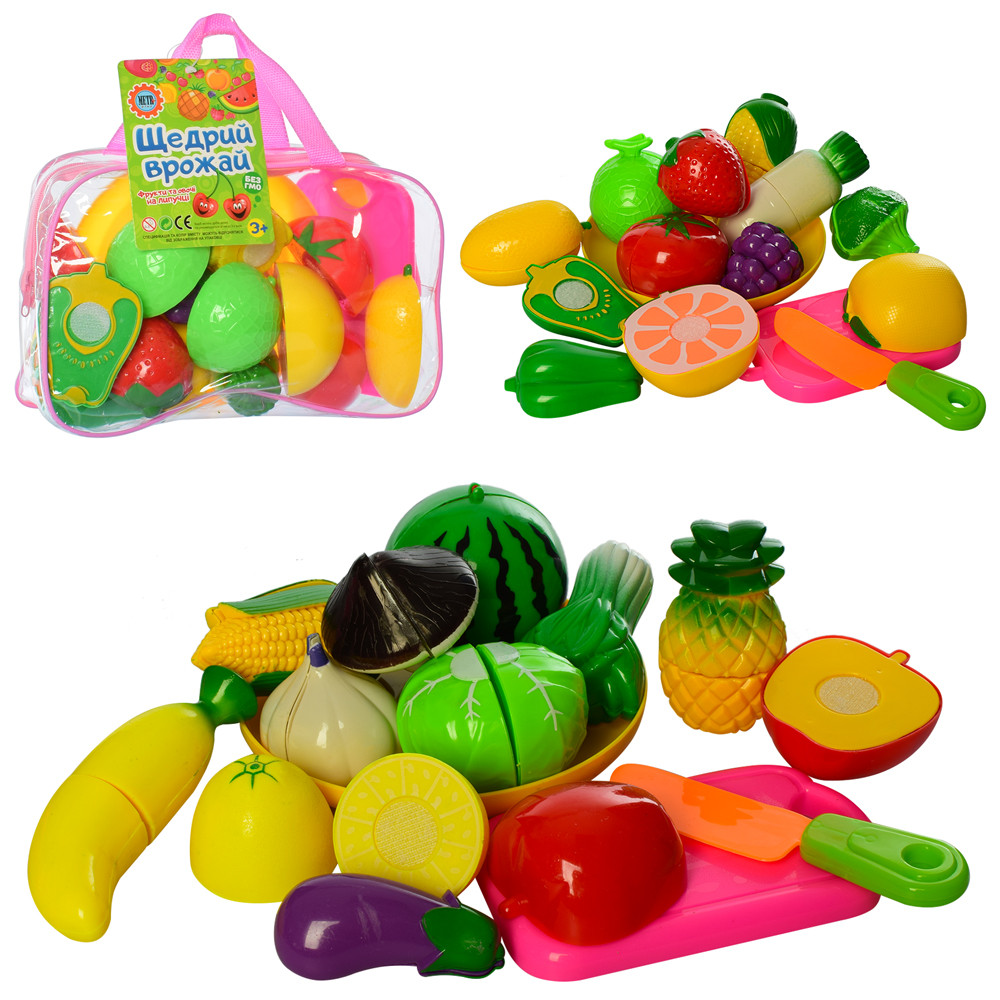 Фрукты 2018 А (96шт) овощи, на липучке, тарелка, досточка, нож, 2 вида, в сумке, 22-14-7см