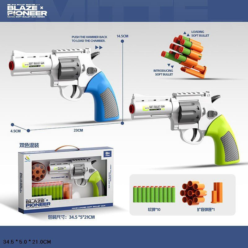 Пістолет арт. 9977-1 (72шт/2) 2кольора, стріляє поролон. знарядами,10поролн зарядів короб. 34,5*5*2