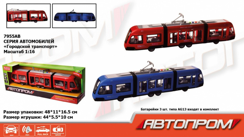 Трамвай АВТОПРОМ арт. 7955AB (18шт) батар.,2 кольор., світ.,звук, короб. 48*16,5*10,5см
